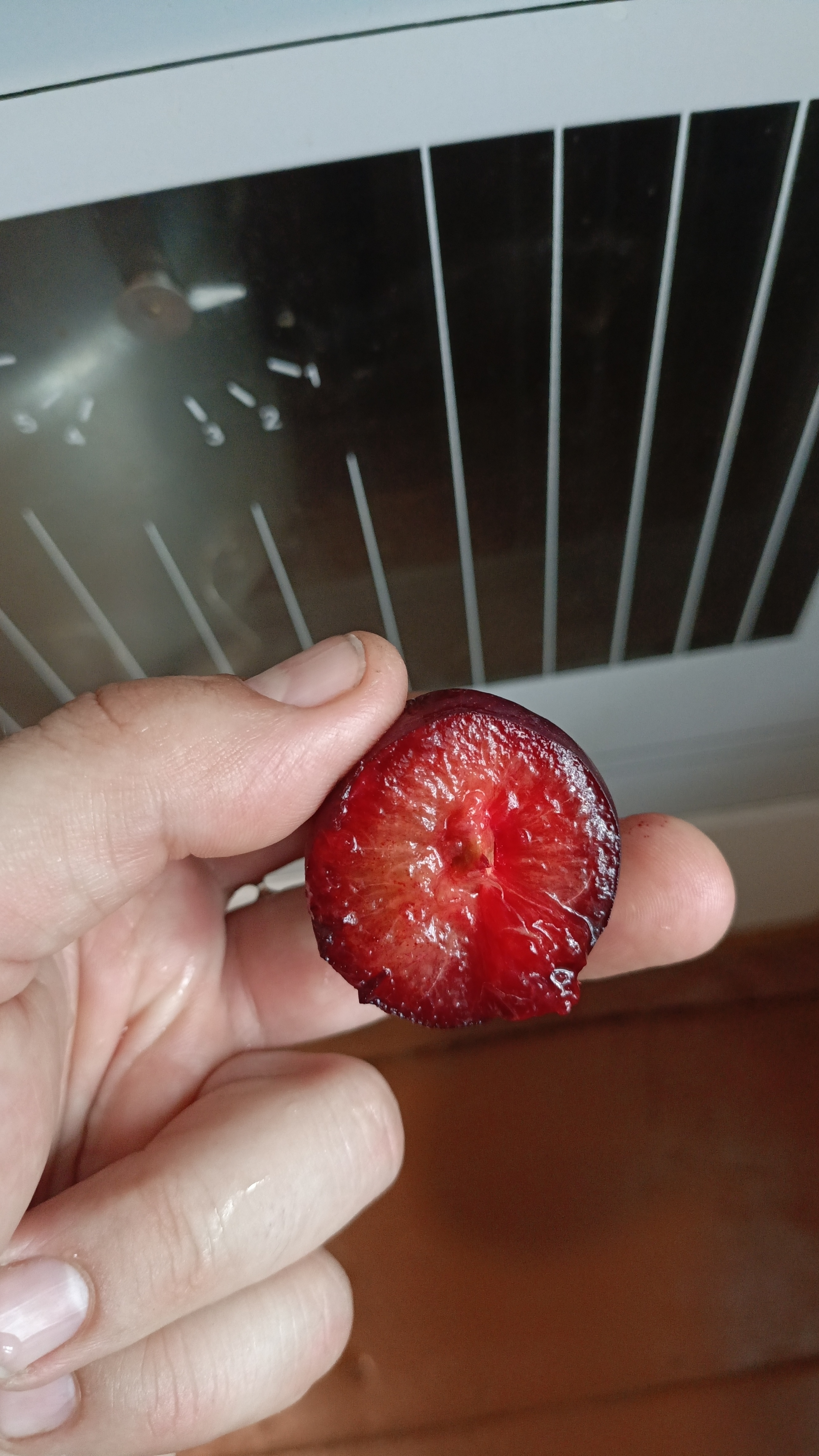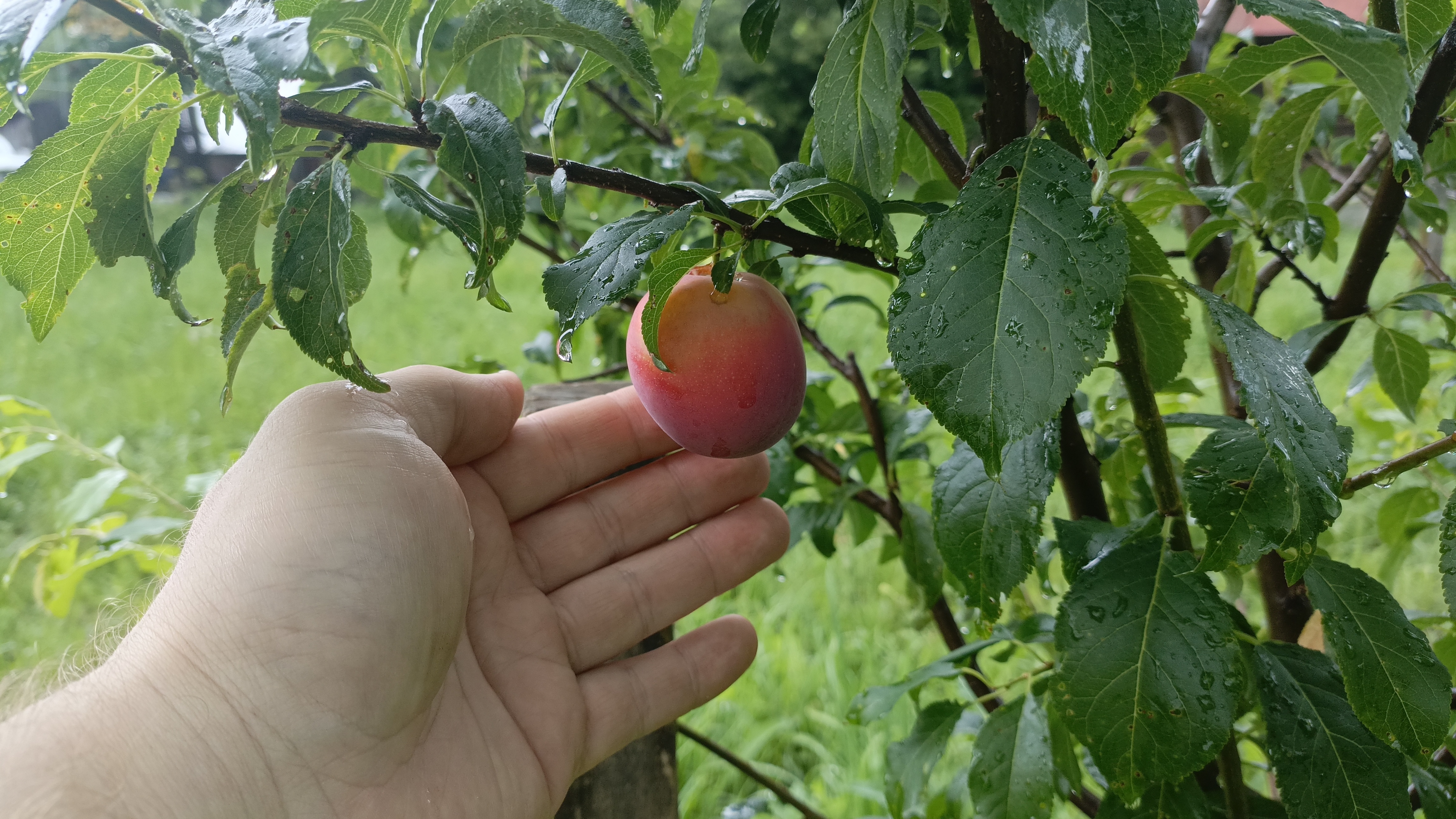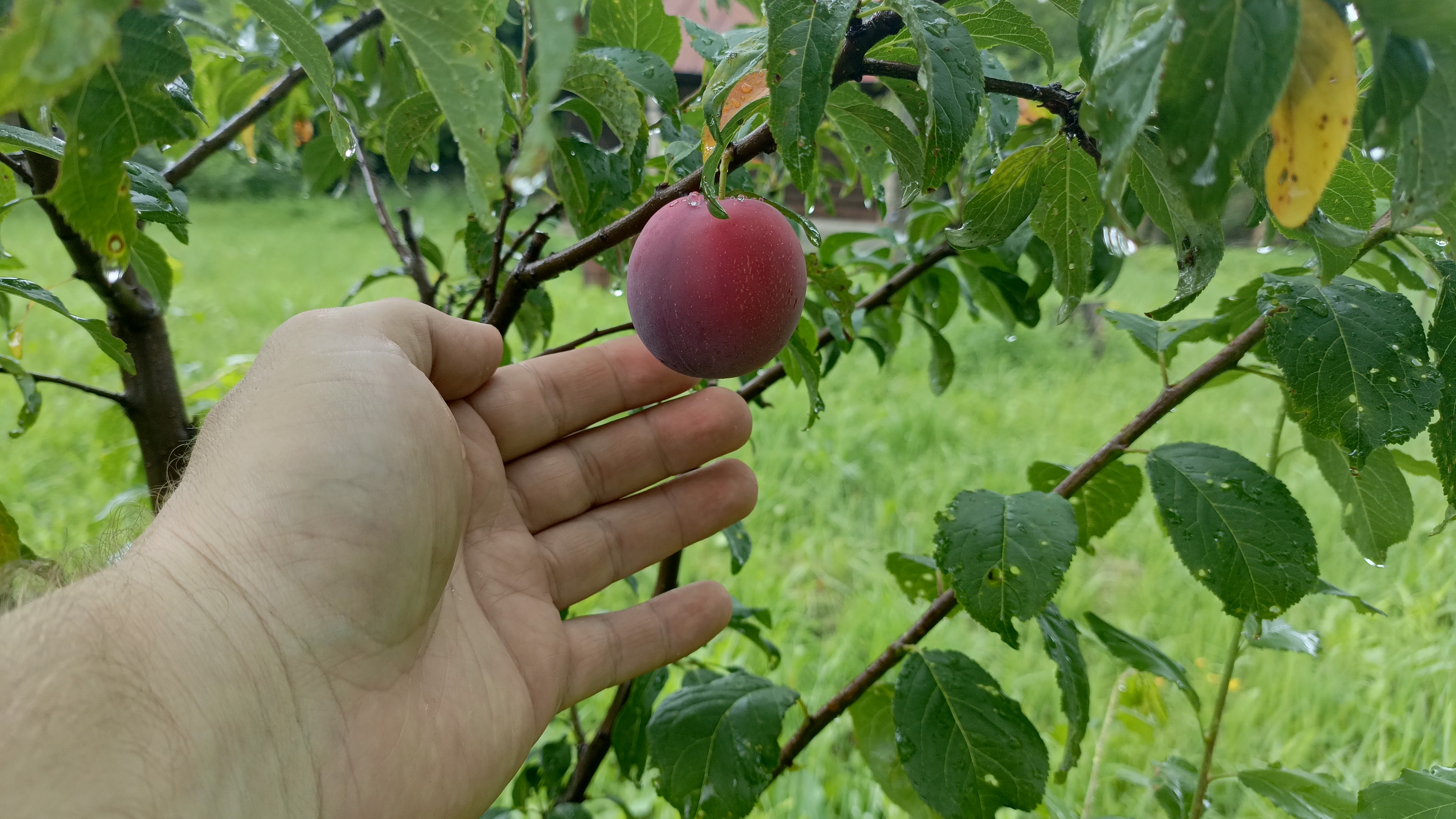 Комментарий: Ворвался в мир русской сливы в 2024 году, посадив среди первых сортов небольшие саженцы Кубанской кометы и Мары из проверенного питомника. После посадки на даче (восток Рязанской области) оба дерева показали внушительный прирост – более 40-60 см на каждом ответвлении. Перезимовали нормально. Укрывал небольшим количеством древесной мульчи, соломы и палок для снегоудержания. Но снега этой зимой стабильно не было))) В 2025 году обе алычи зацвели. Цветочки меленькие, расположены прямо на теле веток. Майские заморозки сделали черное дело. На участке в родном городе (запад Рязанской области), тоже была посажена комета и цветы обожгло морозом. Ну, думаю, не получится попробовать. Приезжаю через месяц на дачу – а там несколько завязей. Снова пессимизм – ведь слива может и сбросить... Но это русская слива, ребята. И она не подвела. Было 5 ягодок и все эти 5 ягодок созрели. Плодоножка плотная, пережила сильные дожди и ветер. Ягода крупная, сладкая, очень сочная, косточка мелкая. Есть во вкусе что-то карамельно-фруктовое. Лишь шкурка напоминает про сливу, она терпкая. Чем дольше висит плод, тем нежнее и мягче внутренность, но и шкурка сливовую терпкость добирает. Ягода вкусная. Посадить стоит.