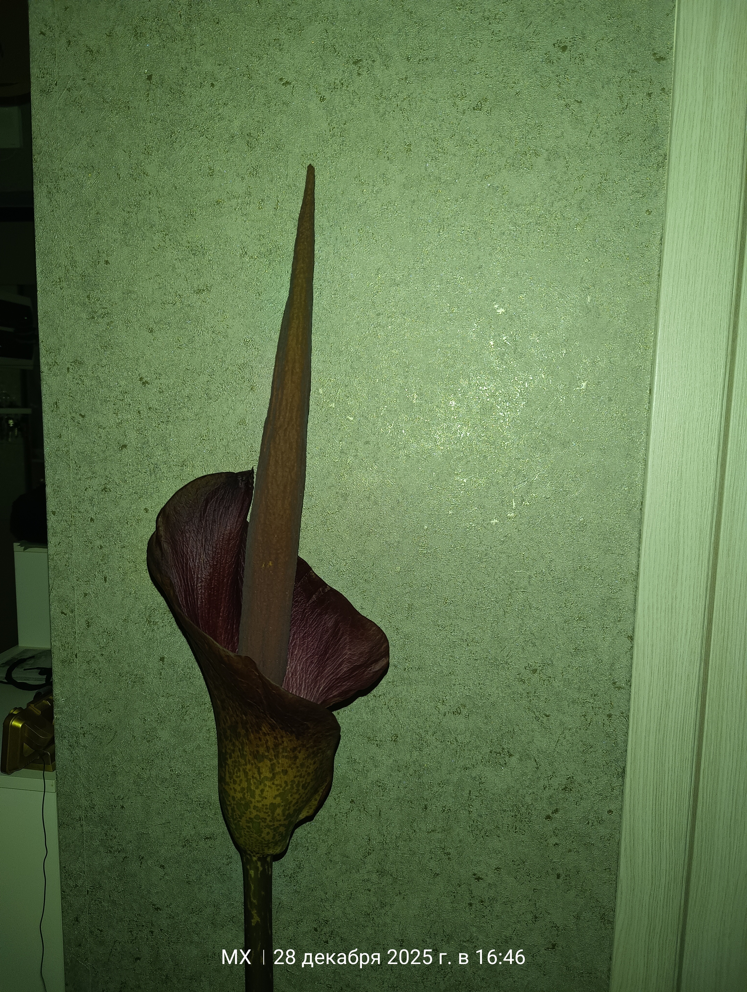 - Титанический вид считается самым крупным и высоким, что можно судить уже по размеру клубня, весящему подчас около 20 кг. Початок такого цветка составляет примерно 2 м в высоту, он окружен мясистым соцветием бордового цвета. Это один из наиболее популярных у цветоводов видов, но вырастить его в домашних условиях не получится ввиду размера.