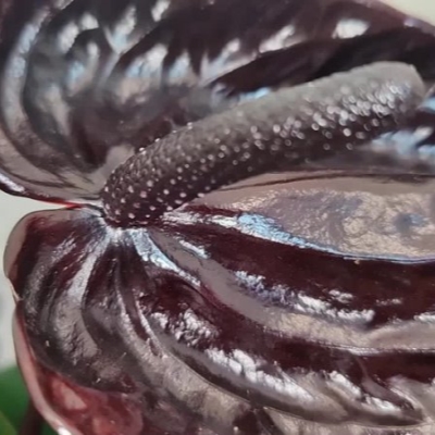 Покрывало у антуриума большое и удлиненное. Его текстура глянцевая и морщинистая, а окраска – черная.