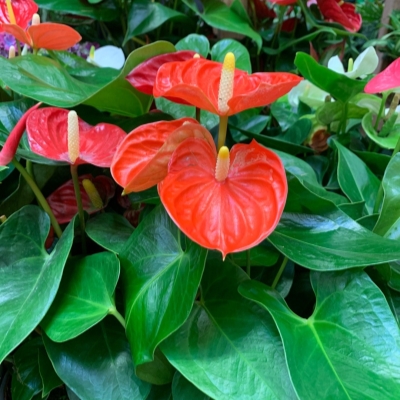 Антуриум Флорида, также известный как Florida, относится к виду Андре (Андреанум). Это растение имеет крупные сердцевидные листья длиной 25-30 см, зеленого цвета. Одна из главных особенностей этого сорта – наличие цветения. Покрывало у него красное.
