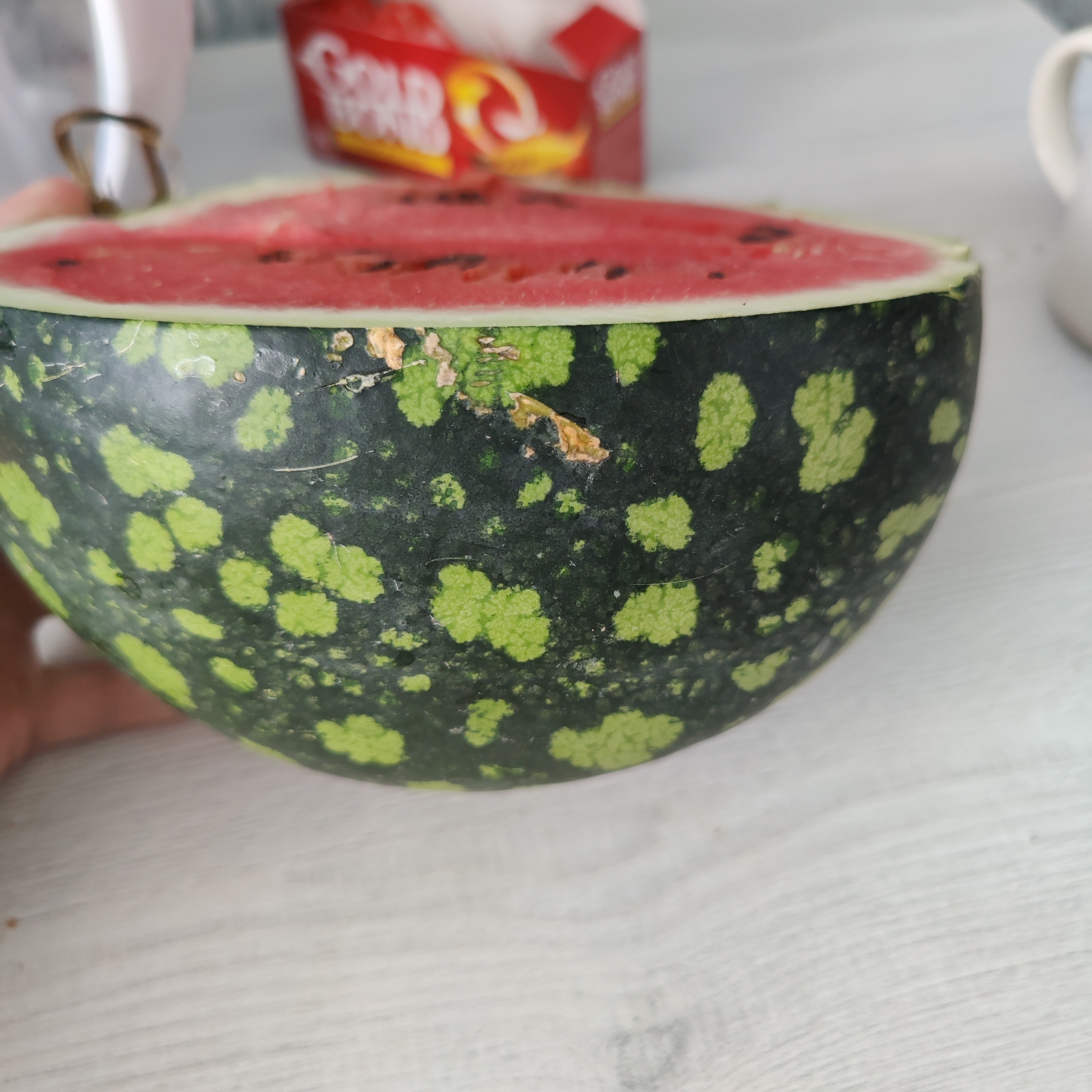 Комментарий: Когда резали арбуз сорта "Русская березка", то брызги летели и поток сока даже на пол! Очень много сока!!!