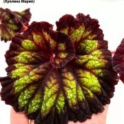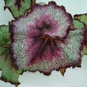 : изумрудно-зеленые, покрыты серебристыми горошками, у основания розовеющими; по краю листа широкая волнистая кайма цвета темного шоколада