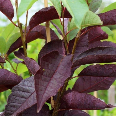 Листья крупные (7-12 см), широкообратнояйцевидной формы и с мелкопильчатым краем. При распускании они имеют зеленый цвет, который со временем меняется на красновато-фиолетовый. Осенью листья становятся ярко-красными. Пластинки довольно плотные и придают дереву особую декоративность в течение всего сезона.