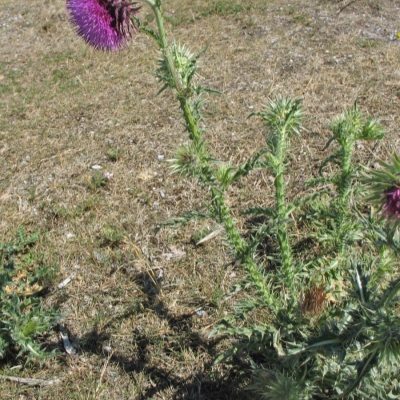 Это жестко-колючее растение высотой до 150 см с прямостоячими стеблями. Стебли могут быть простыми или ветвистыми в верхней части; они слабопаутинистые и ребристые. Под корзинками находятся беловойлочные участки без крыльев и шипов, тогда как ниже расположены выемчато-зубчатые крылья с игловидными шипами длиной от 3 до 8 мм.