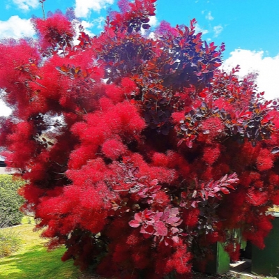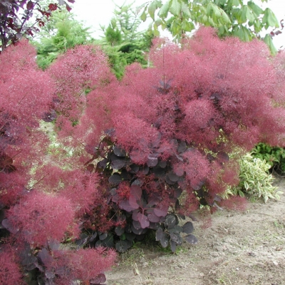 - Grace. Один из самых высокорослых сортов, побеги достигают 5 м в высоту. Этот сильно ветвящийся кустарник относится к краснолистным скумпиям, осенью пурпурно-красный оттенок листовой пластины сменяется пламенеющим алым. Соцветия имеют коническую форму, довольно крупные, до 20 см в длину, окрашены в розово-фиолетовый цвет.