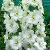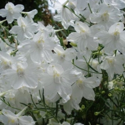 Цветки дельфиниума открытые, белого цвета, достигают в диаметре 3,5 см. Они собраны в редкую кисть на конце стебля, что создает эффект легкости и воздушности композиции. Данный сорт активно используется в ландшафтном дизайне для создания смешанных групп, рабаток и миксбордеров, а также подходит для срезки.