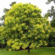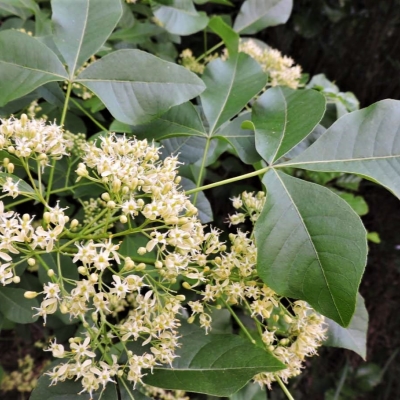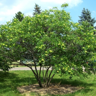 Птелея выделяется своей формой – это либо невысокое дерево, либо кустарник. Крона изначально может быть округлой, но со временем становиться шатровидной и ажурной. Листья этого растения тройчатые, железистые, с продолговато-эллиптической или яйцевидной формой, достигают размера от 6 до 12 см. Осенью листья могут менять цвет с зелено-желтого на насыщенно-желтый.