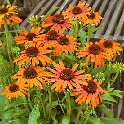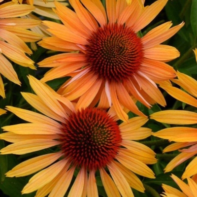 Во время цветения эхинацея порадует крупными цветами, достигающими в диаметре 12 см. Язычковые лепесточки располагаются как лучики вокруг коричневой шишковидной, выступающей и щетинистой сердцевины. Окрас цветка – ярко-оранжевый с коричневым центром. Цветы эхинацеи немахровые и обладают ароматом средней выраженности.