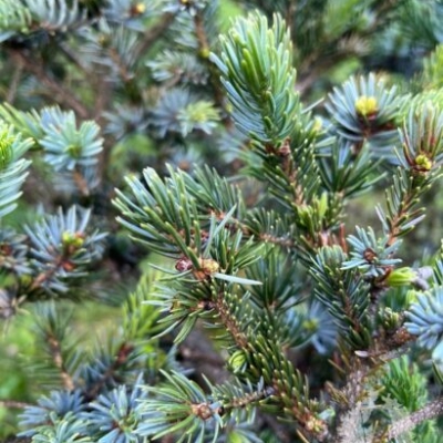 Хвоя короткая и колючая. Сверху она темно-зеленая, а снизу белая и желтоватая. Окраска хвои сохраняется только на солнечном месте. Молодые приросты имеют желто-зеленый цвет. Незрелые шишки демонстрируют красно-фиолетовую окраску, а зрелые – светло-коричневую.