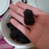 Темно-фиолетовый окрас ягод воспринимается как черный, фиолетовость можно увидеть только при попадании сока на кожу. Выглядят плоды декоративно, поскольку интересно переливаются в солнечных лучах. Мякоть у них весьма сочная, с плотной текстурой. Вкус сладкий, кислинка едва заметна. Хорошо слышны нотки сливы, черешни, вишни. Оценка вкуса специалистами – 4,8 балла.