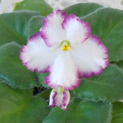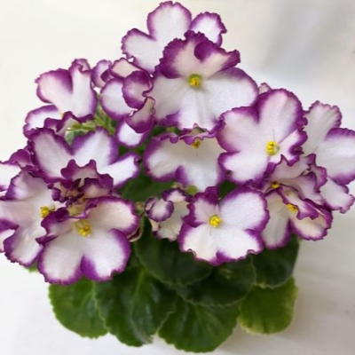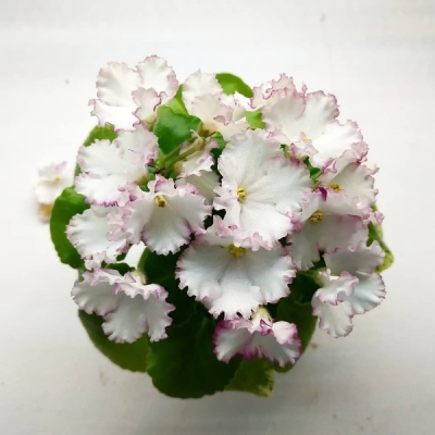 Цветы на фиалке этого сорта вырастают крупными. Основной цвет лепестков белый, по краю идет розовая каемка.