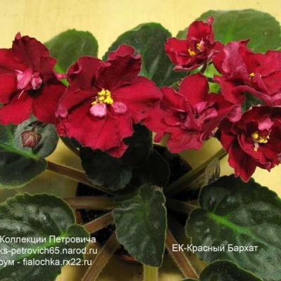 Фиалка ЕК-Красный бархат (синонимы названия: EK-Red Velvet, EK-Crasnyi Barchat) является одним из самых популярных сортов. Автором этого великолепного сорта является Коршунова Е.