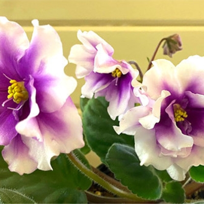 Цветы сорта ЕК-Под Счастливой Звездой также заслуживают отдельного внимания. Они полумахровые и достигают размера 6-7 см в диаметре. Центр каждого цветка имеет насыщенный пурпурный оттенок, который плавно переходит к широким белым краям. Эта комбинация цветов создает эффектный контраст и делает растение особенно привлекательным для любителей комнатных растений.
