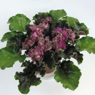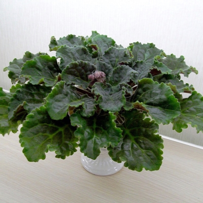 Розетка фиалки компактная и плотная, состоящая из средне-зеленых однотонных листьев со слегка волнистым краем.