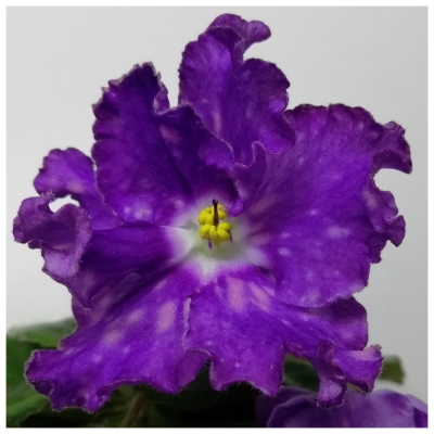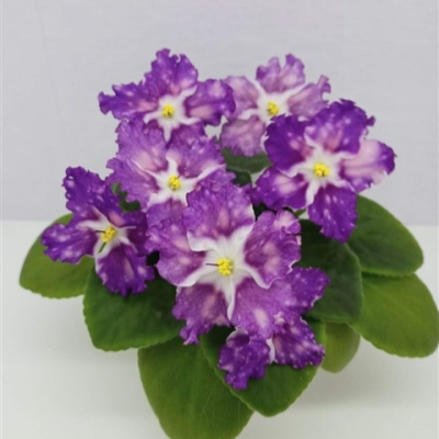 У этой фиалки ровная розетка размера стандарт, светло-зеленые листочки, однотонные, плотные. Цветок очень красивый, нежно-лавандовый, имеет белый глазок и розовые горохи. Основным окрасом считается сиреневый. Цвет темный, тип окраски – трехцветный. Фиалка простая полумахровая, лепестки отличаются волнистым краем, цветок имеет звездчатую форму и относится к крупноцветковым.