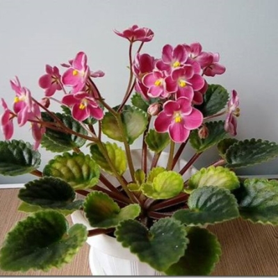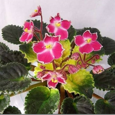 Розетка фиалки аккуратная, обычного типа, размер полумини. Листья слегка заостренные, со стеганой поверхностью. Окраска листьев желтая, переходящая в темно-зеленый цвет. Тип окраски – пестрые, а вид пестролистности – Кроновая пестролистность (Champion). Край листа украшен фестонами.
