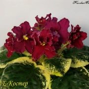 Розетка фиалки аккуратная, обычного типа, размер полумини. Листья слегка заостренные, со стеганой поверхностью. Окраска листьев желтая, переходящая в темно-зеленый цвет. Тип окраски – пестрые, а вид пестролистности – Кроновая пестролистность (Champion). Край листа украшен фестонами.