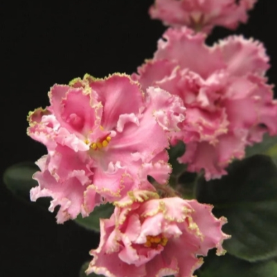Важно отметить двухтоновую окраску цветов: сочетание палево-розового основного цвета с зеленой каймой создает эффект многослойности и глубины восприятия каждого отдельного цветка. Это делает каждую фиалку уникальной не только по форме, но также по своему окрасу.