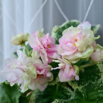 Цветки фиалки имеют трехцветную окраску: белую, розовую и зеленую. Основная окраска цветков может быть как белая, так и розовая или зеленая. Цветы этого сорта довольно бледные по насыщенности цвета.