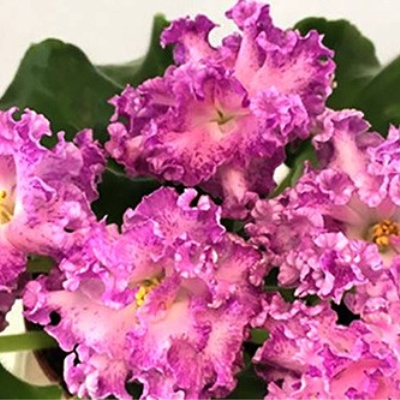 Цветки фиалки двухцветные, бело-розовые с широкой пурпурной каймой напыления. Основная окраска цветков может быть как белая, так и розовая в зависимости от условий выращивания. Край лепестков волнистый, цветы полумахровые.