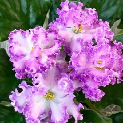 Цветение этого сорта фиалок длится около 2-3 недель. В это время на растении появляются большие белые или розовые цветки с пурпурной каймой.
