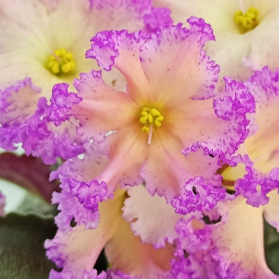 Цветки сенполии крупные и обладают уникальной трехцветной окраской. Основная палитра включает розовые и желтые оттенки, которые плавно переходят друг в друга. На лепестках можно заметить жёлтое напыление из центра цветка и малиновый крап на кончиках лепестков, что придаёт им особую выразительность. Махровость у этого сорта отсутствует, а край лепестка имеет выемчатую форму.