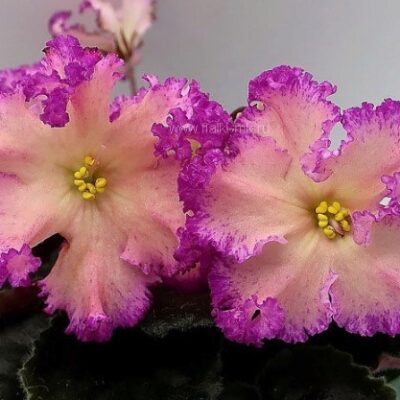 Цветки сенполии РМ-Янтарное Ожерелье поражают своей красотой и оригинальностью. Основная окраска лепестков — насыщенный розовый цвет, который дополнен широким желтым напылением из центра цветка и малиновым крапом на кончиках волнистых лепестков. Цветы имеют форму звезды и являются крупными, что делает их особенно эффектными в интерьере. Край лепестка бахромчатый, а кайма имеет малиновую окраску, что придает дополнительную выразительность.