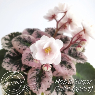 Фиалка Robs Sugar Cube была создана в 1994 году автором R. Robinson. Этот сорт относится к полуминиатюрным фиалкам и имеет плотную, компактную розетку обычной формы. Листья округлые с заостренным кончиком, стеганые, средне-зеленые с белой или розовой пестролистностью.