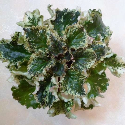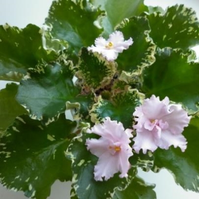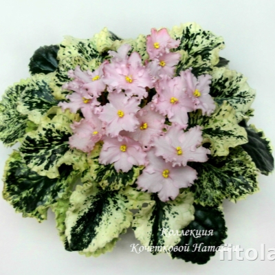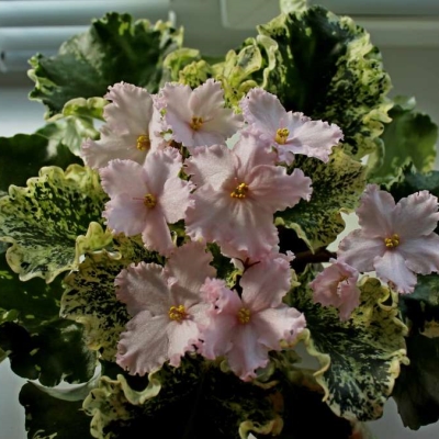 Розетка крупная, красивая и нарядная. Ее размер соответствует большому стандарту. Листья крупные, темно-зеленые с белой и розовой мозаичной пестролистностью (Lillian Jarret). Край листа волнистый.