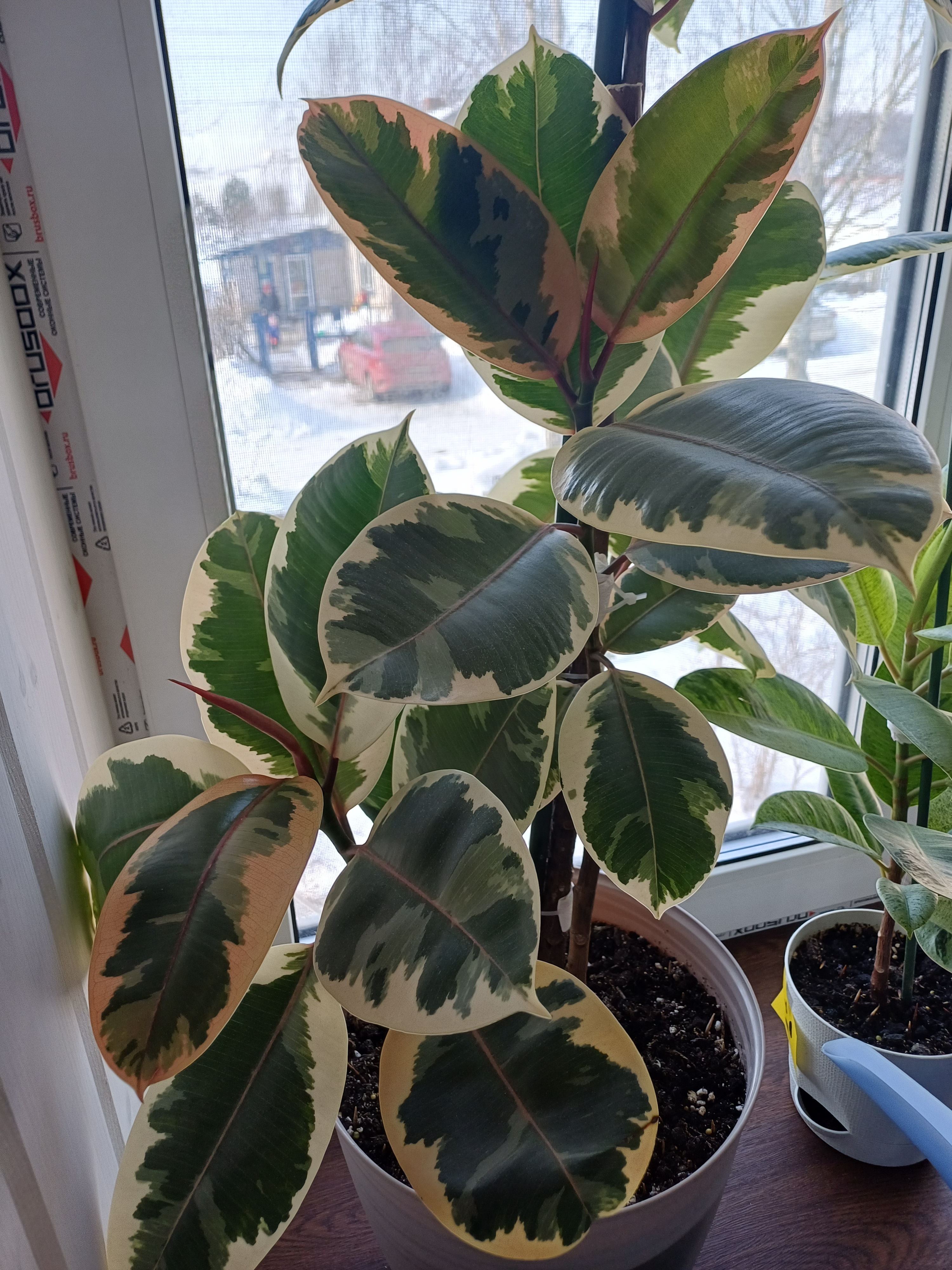 Листва у растения довольно крупная. Края листов слегка заострённые. Поверхность у них гладкая. Цвет листовой пластины может быть как бледно-зелёным, так и кремовым или светло-розовым. На поверхности листов можно увидеть заметные красные прожилки. Окрас листвы зависит от возраста растения, а также от того, получает ли оно достаточно солнечного света.