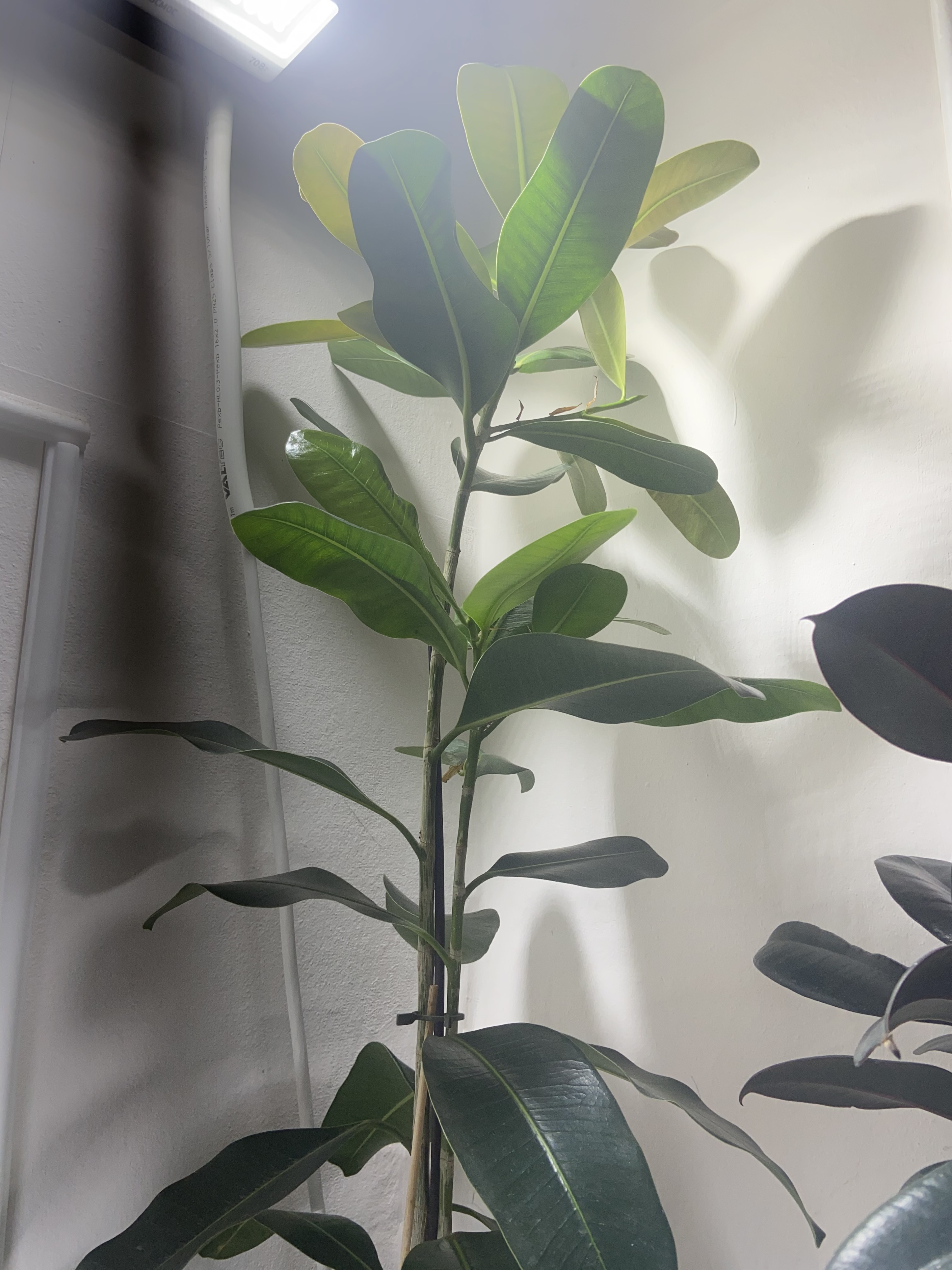 Листья эллиптические, крупные, длиной от 15 до 30 см и шириной около 12 см. Поверхность листьев кожистая, цвет темно-зеленый. Воздушные корни у этого растения также присутствуют.