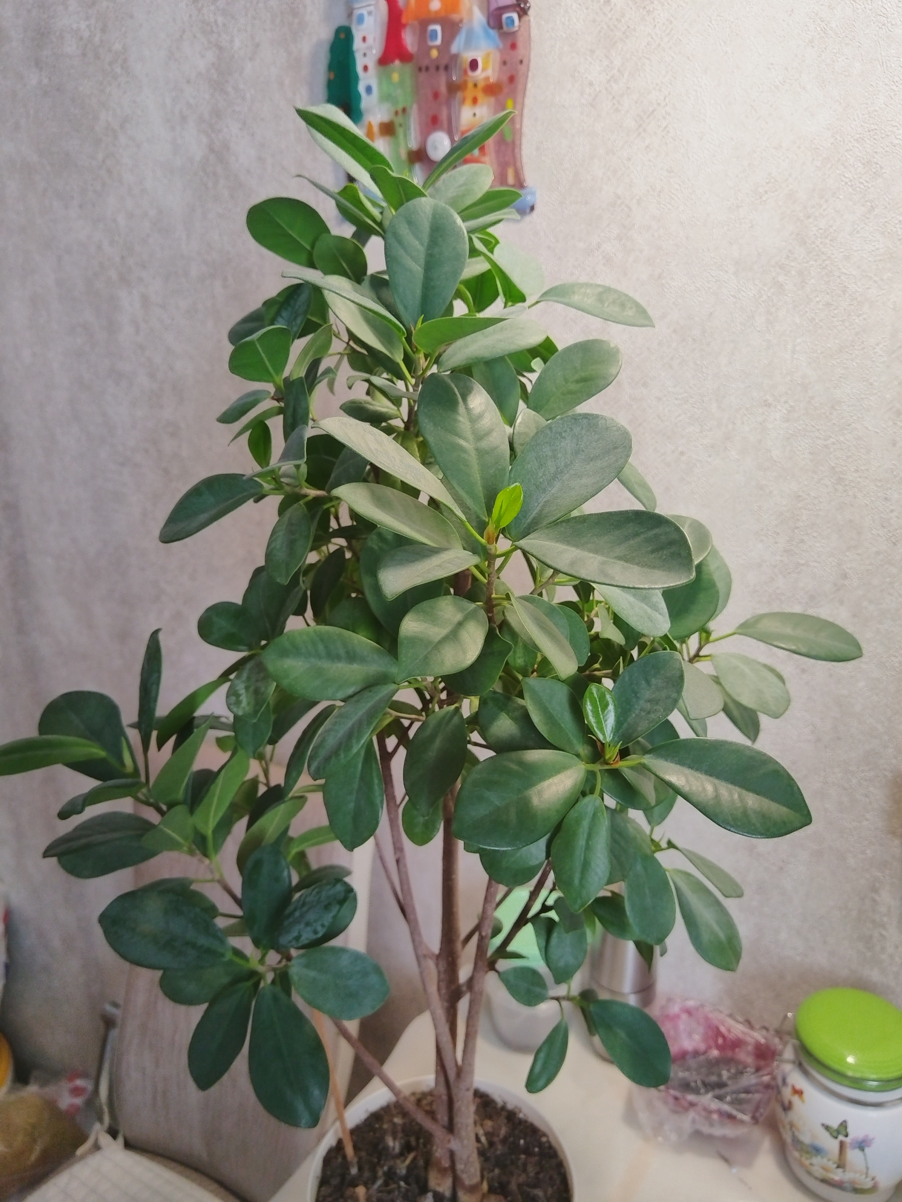 Преимущества: очень простое растение не требующее особо трепетного отношения. За 2 года сформировалось миниатюрное деревце (регулярно обрезка кроны). Листва ярко зеленая, глянцевая, сбрасыванием листвы в отличии от других представителей фикусов этот вид не страдает. Подкормка с весны до осени один раз в две недели.