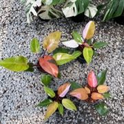 : темно-зеленого цвета, а при хорошем освещении приобретают необычный розовый оттенок, покрывающий часть или весь лист. Нижняя часть листьев имеет бронзовый цвет, который эффектно сочетается с розовым