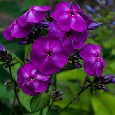 Цветки у флокса достаточно крупные – диаметр каждого экземпляра составляет 3.7-4 см. Форма цветочка колесовидная. Структура средней плотности, немахровая, состоящая из пяти одинаковых округло-овальных лепестков с гладкой поверхностью и слегка завернутыми наружу краями. Лепестки плотно прилегают друг к другу, поэтому пирамидальное соцветие выглядит объемно и не очень ажурно. Изюминкой сорта является его окрас – от темно-фиолетового до оттенков пурпурно-лилового, разбавленного более светлыми тонами по центру, с красновато-малиновым колечком. Аромат у флокса высокой интенсивности, с доминирующими душистыми нотками, которые особенно слышны в вечерние часы.
