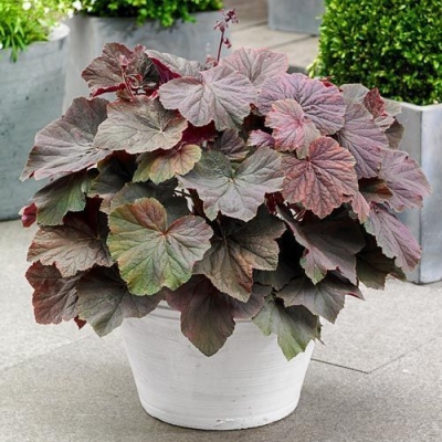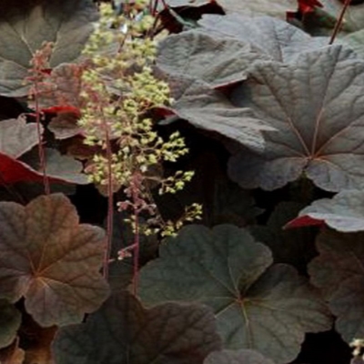 Этот сорт имеет высоту от 70 до 100 см и ширину от 65 до 90 см. Листья гейхеры крупные, размером до 10-17 см. Их форма напоминает листья клена. Они окрашены в зелено-сливовые тона, а обратная сторона листьев имеет ярко-фиолетовую окраску.