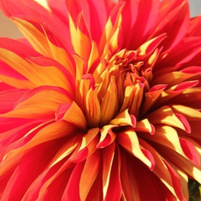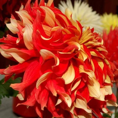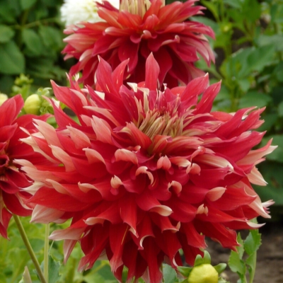 Это мощный куст, достигающий высоты 100-120 см. Его стебли полые, а листья многочисленные и перистые. Листья имеют темно-зеленую окраску. Размер соцветий этого сорта составляет 20-25 см в диаметре. Верхняя сторона махровых цветков окрашена в красный цвет, а нижняя – в кремовый. Георгина имеет двухцветную окраску и лепестки, которые слегка закручены на концах.