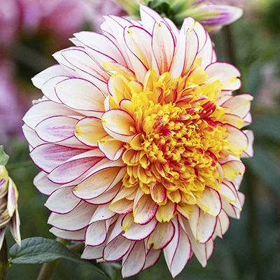 Форма соцветий представляет собой корзинку. Яркий желтый центр контрастирует с бело-красными лепестками, создавая гармоничное сочетание цветов. Такие характеристики делают георгины Полька отличным выбором для создания красочных композиций как в открытом грунте, так и в букетах.