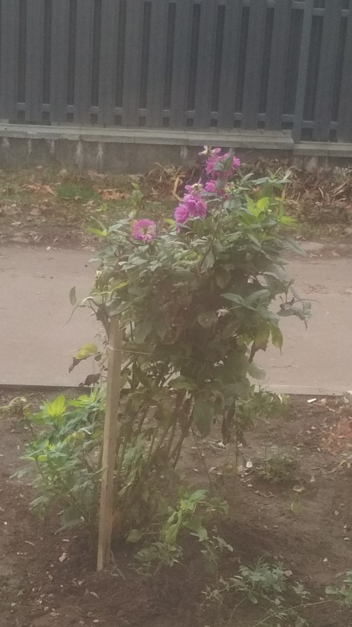Комментарий: Глубокая осень, 8 ноября, а моя георгина не думает о зиме! Все растения вокруг сбросили листву, а у моей здоровая сочная зелень, и цветы, цветы... Даже к такому времени есть ещё нераспустившиеся бутоны, которые я уже оборвала, чтобы георгина отдохнула, подготовилась к зиме, к выкопке клубней. За сезон было много бутонов, ярких, больших. Никто растение не ест, не подхватывает болезни. Замечательный, великолепный сорт!