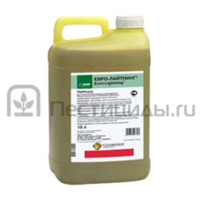 Гербицид Евро-Лайтинг выпускается в пластиковых емкостях по 5 и 10 литров и представляет собой концентрированное вещество, растворимое в воде.