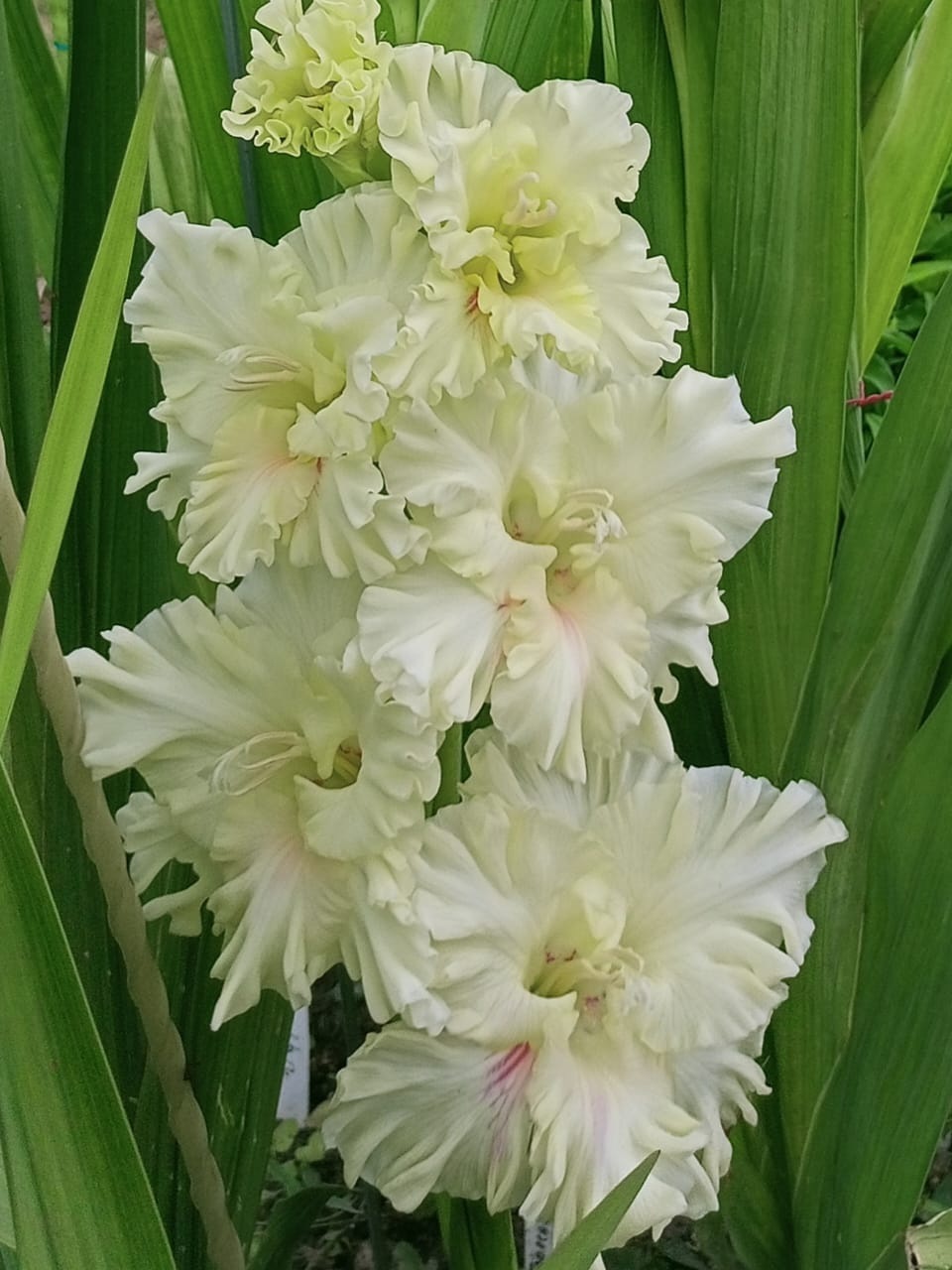 Этот гладиолус имеет прочный цветонос, на котором расположены двухрядные соцветия длиной 70-75 см. В каждом соцветии содержится до 23 цветков, из которых одновременно распустившихся может быть до 9 штук. Цветки этого сорта довольно крупные – диаметр составляет 14,5 см.