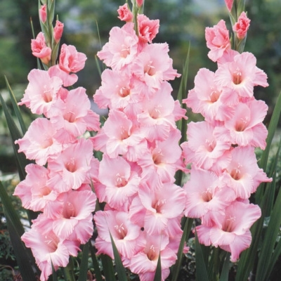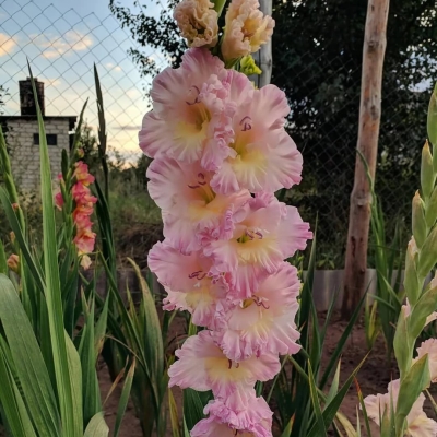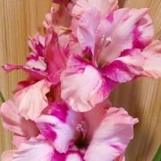 Гладиолусы Тройка относятся к среднецветущим видам данного растения. Их период цветения приходится на летний период – июль-сентябрь. Цветки имеют диаметр около 18 см и обладают прекрасной гофрированной формой края лепестков. Они окрашены в розовый цвет с пастельно-желтым пятном в центре каждого цветка.