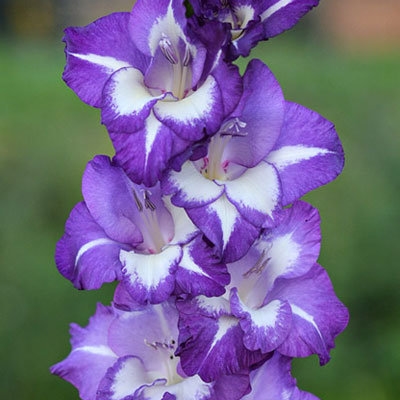 Этот гладиолус достигает высоты 165 см и имеет прямой рост. Листья зеленые, простые. Количество цветков в соцветии составляет 21 шт., при этом одновременно распустившихся цветков может быть до 8. Длина соцветия достигает 80 см, а размер цветка гигантский (более 14 см). Форма цветка воронковидная, а форма края лепестка гофрированная. Окраска лепестков очень необычная: края фиолетово-чернильные, а в центре большое белое пятно с белыми стрелками на лепестках.