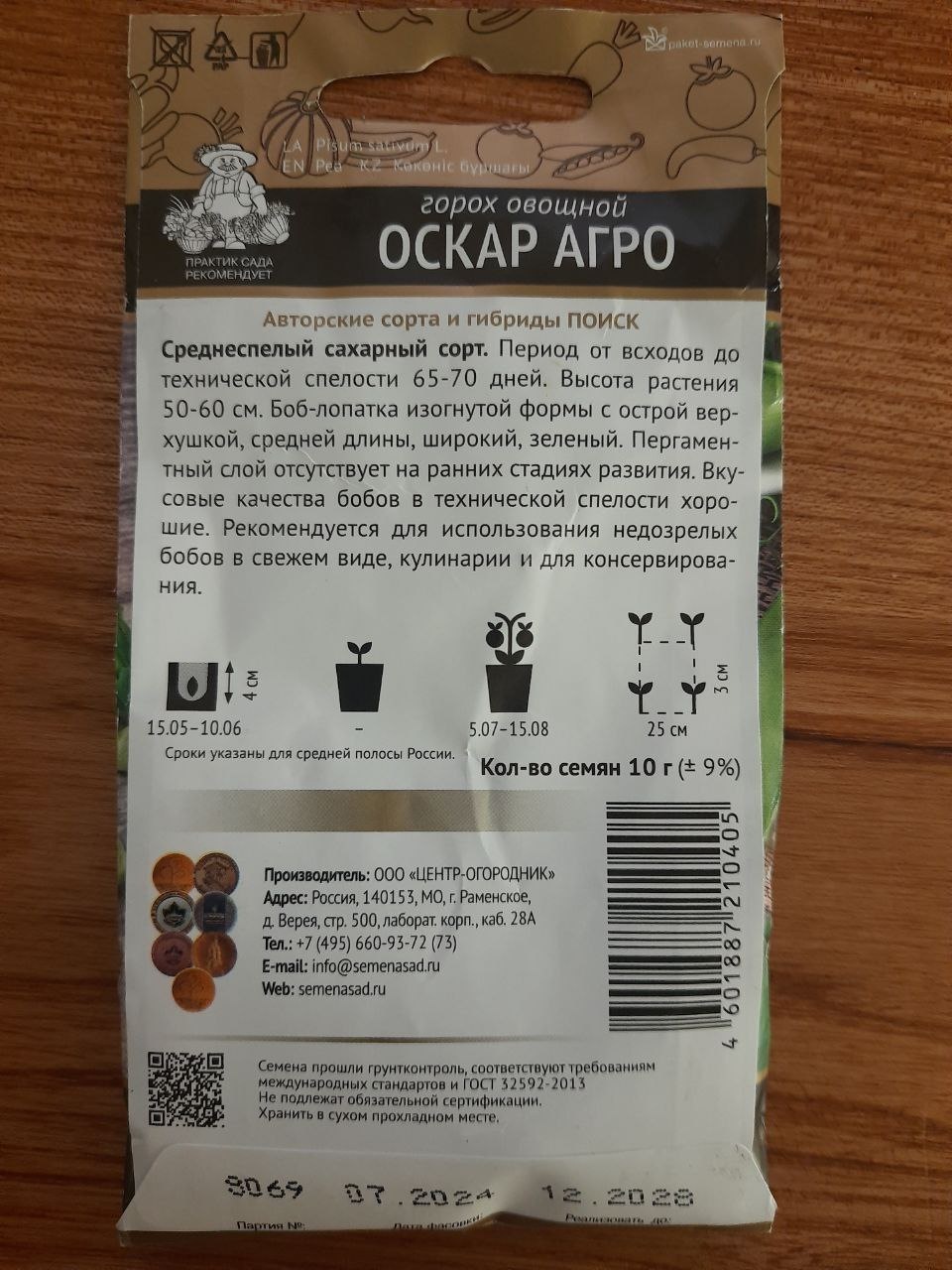 Период от всходов до получения урожая составляет около 70 дней. Средняя урожайность бобов гороха Оскар Агро составляет 1,4 килограмма на квадратный метр.