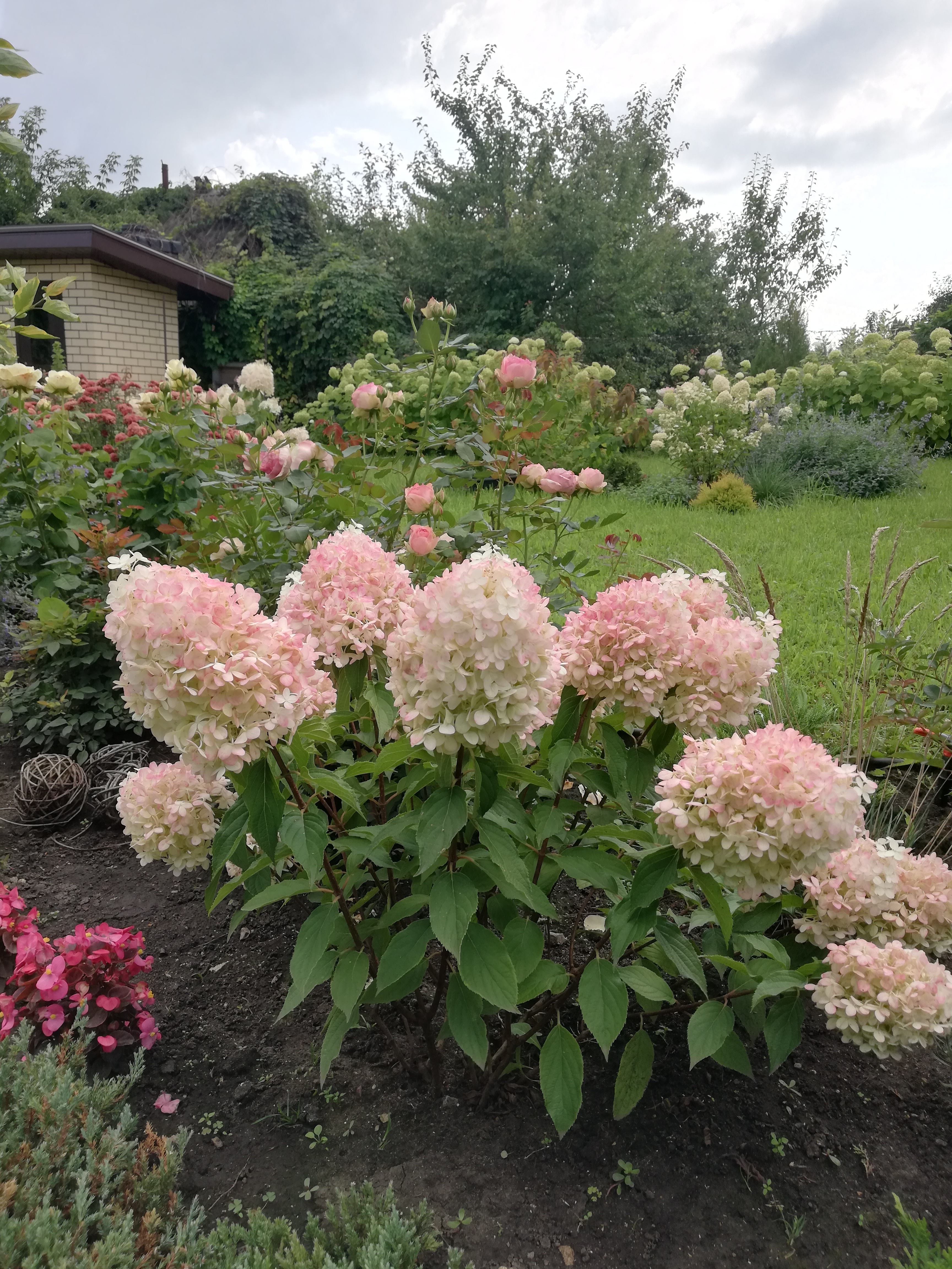 Форма соцветия гирляндовидная, коническая. Размер цветков крупный, плотность соцветия высокая. Цветки зеленовато-белые, на протяжении всего лета и осени постепенно меняют свой оттенок на ярко-розовый.