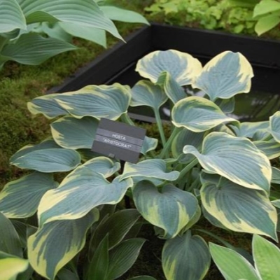 Хоста Аристократ (синоним названия – Aristocrat) была выведена селекционерами из США в 1997 году. Она представляет собой раскидистый куст, относится к среднерослым хостам и достигает высоты около 35-40 см. Ширина куста может быть до 50 см. Листья этой хосты большие, широкоовальные, с сердцевидными перекрывающимися долями. Окраска листьев насыщенно-голубая с бледно-серыми полосами и широкой, очень неравномерной кремово-белой каймой. Черешки листьев голубовато-зеленые с кремовым контуром. Хоста Аристократ обладает контрастной листвой, которая делает растение очень декоративным.