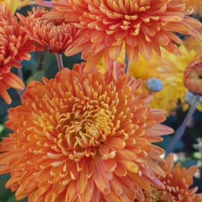 Каждый отдельный цветок имеет уникальную структуру: двуслойные соцветия формируются таким образом, что внутренние лепестки более короткие и махровые по сравнению с внешними длинными лепестками. Это создает интересный текстурный контраст между различными частями соцветия. Окраска варьируется от светлых до темных оттенков желто-оранжевого цвета, что добавляет разнообразие в палитру осеннего сада.
