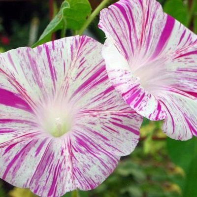Цветки у ипомеи Карнавал Венеции – крупные, диаметром 6-7 см. Форма – граммофон. Цветки немахровые, имеющие пеструю окраску, преимущественно бело-голубую или розово-голубую. На стеблях цветки расположены довольно густо и крепко. Благодаря этому в момент массового цветения ипомея становится похожа на прочный, живой и очень красивый ковер.