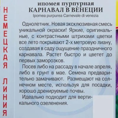Карнавал Венеции – это очень красивая и быстрорастущая садовая лиана. Однолетнее растение получило широкое применение в вертикальном озеленении балконов, перил, садовых беседок, пергол, заборов и стен домов.