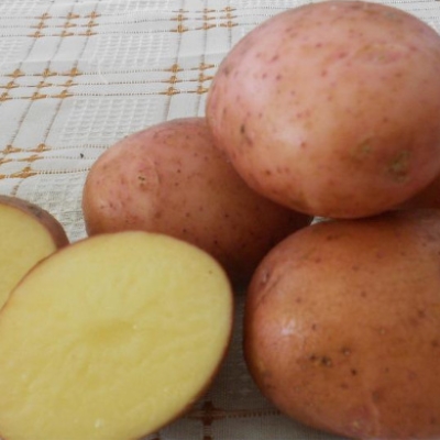 Размер клубней средний: их масса колеблется от 89 до 117 граммов. Форма клубня овальная, что удобно для сбора урожая и дальнейшей переработки. Окраска кожуры красная с гладкой структурой, а мякоть имеет желтый цвет. Глубина глазков мелкая, что также является положительной характеристикой данного сорта.
