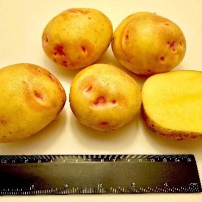 Клубни этого сорта имеют овально-округлую форму со средней массой от 103 до 140 граммов. Они отличаются частично красной кожурой. Мякоть же имеет светло-жёлтый или желтый оттенок, что делает его визуально привлекательным для потребителей.